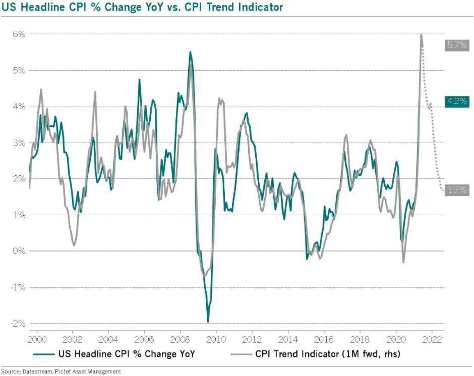 However, the thing to note is that such a release will still be brushed aside by the Fed surely as part of transitory factors. Pictet points out that we might see a peak in US CPI over the next 2-3 months before it tails off and slides towards next year: