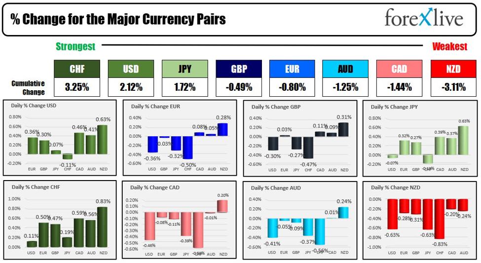 IN the forex market, the traders pushed into the relative safety of the CHF. The USD was also higher. The weakest currencies were the”risk currencies” with the NZD and the AUD being the weakest of the majors. Below is a ranking of the strongest to the weakest as the clock ticks to the end of the day.