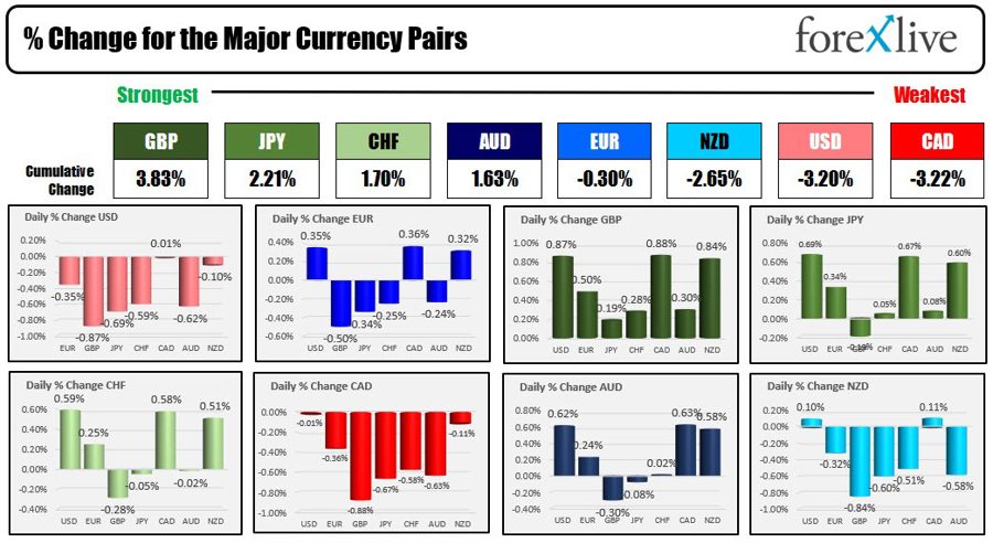 IN the forex market, the GBP is ending the day as the strongest of the majors. The weakest was the a virtual tie between the USD and the CAD. The dollar fell -0.87% vs the GBP and -0.69% vs the JPY.