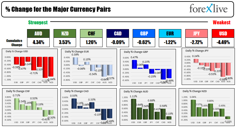 As a result, the USD moved lower and was the weakest of the major currencies (the flow of funds went mostly into the “risk on” AUD and NZD which were the strongest of the majors – each moved over 1% on the day vs the greenback).