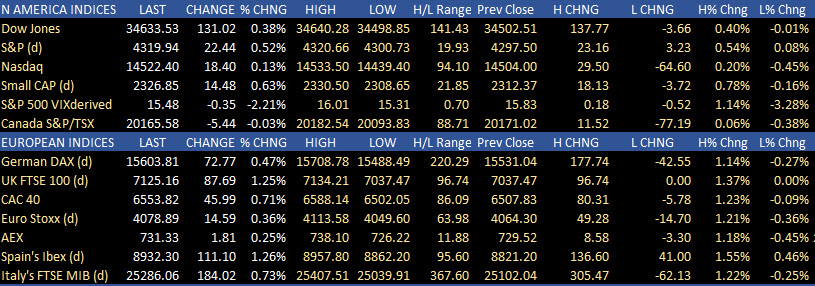 In Europe, the major indices closed higher led by the Spain’s Ibex, and UK FTSE 100 (each rose around 1.25%).