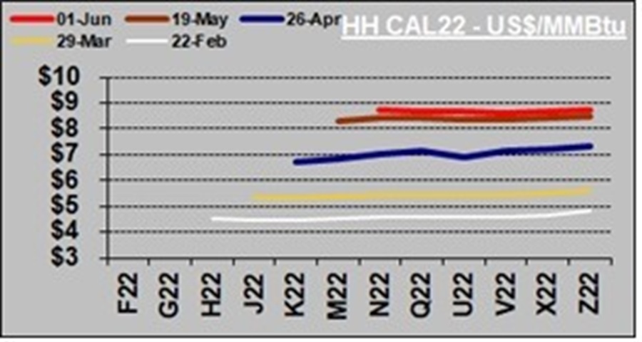 Henry Hub natural gas prices are currently trading up almost 30 cents with the most traded July ’22 contract (N) at $8.82 MMBTU. The entire forward curve is strongly up, with two different trends to stress (see the graph below): (1) the strong backwardation we have, if we consider all the Cal’22 (calendar’22) compared to the Cal’23. Indeed, April’ 23 trades at $5.64, with a huge ‘widow maker premium’ (March’23/April’23 spread of around $1.82; (2) the backwardation we have within the Cal’22, with July’22 contract currently trading over November (X), that is at $8.754