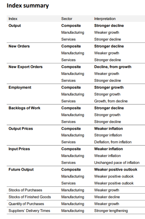 - decline in overall private sector activity was led by the larger services sector, where business activity fell for the nineteenth consecutive month and at the quickest pace since May 2020
