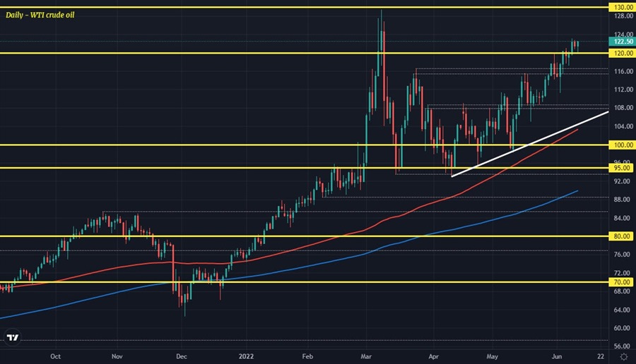 But buyers held on near the figure level, alongside the 100-hour moving average at $120.27 at the time, before pushing back higher in European morning trade. WTI crude is now up $1 or 0.8% to $122.50 at the highs for the day: