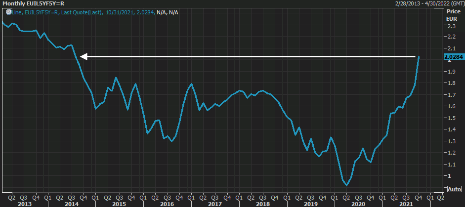 The key market gauge of long-term euro area inflation expectations hits a fresh seven-year high, exceeding the ECB’s target