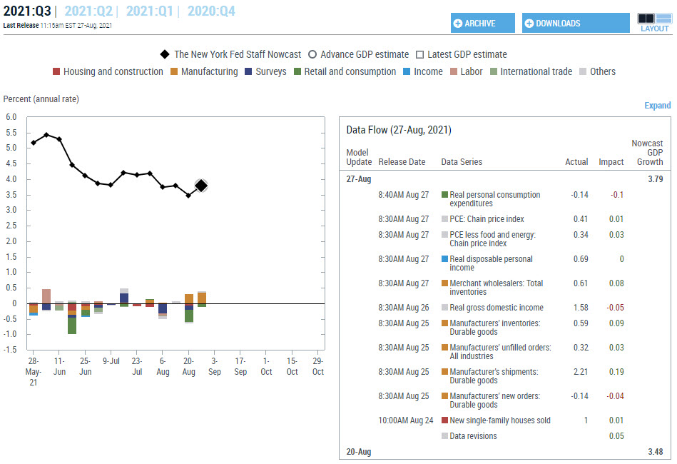 The GDPNow model estimate for real GDP growth (seasonally adjusted annual rate) in the third quarter of 2021 is 5.1percent on August 27, down from 5.7 percent on August 25. After recent releases from the Bureau of Economic Analysis and the U.S. Census Bureau, the nowcasts of third-quarter real personal consumption expenditures growth and third-quarter real gross private domestic investment growth decreased from 3.2 percent and 26.5 percent, respectively, to 2.2 percent and 23.6 percent, respectively, while the nowcast of the contribution of the change in real net exports to third-quarter real GDP growth increased from -1.39 percentage points to -0.90 percentage points.