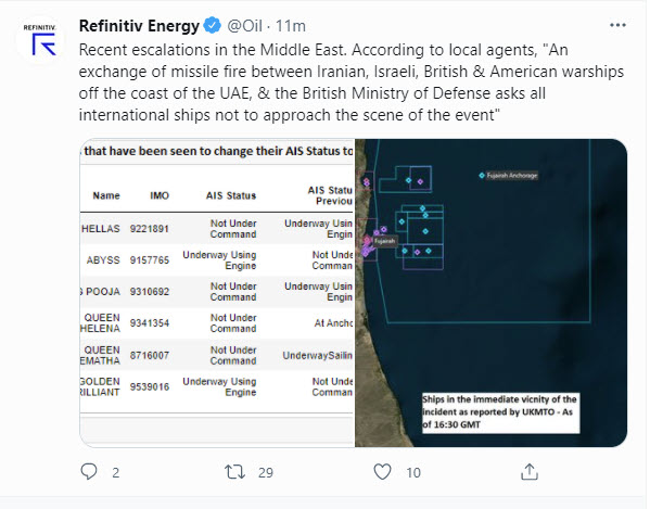 Tweet from Refinitiv Energy on missile fire has now been deleted.