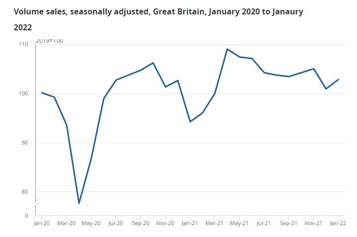 After the omicron impact in December, retail sales activity picked up to start the new year with non-food stores sales volumes increasing by 3.4% on the month. That is offset by a first drop in food store sales volumes to below pre-pandemic levels for the first time (seen 0.8% below levels in February 2020). Overall, retail sales volumes were seen 3.6% higher than pre-pandemic i.e. February 2020 levels.