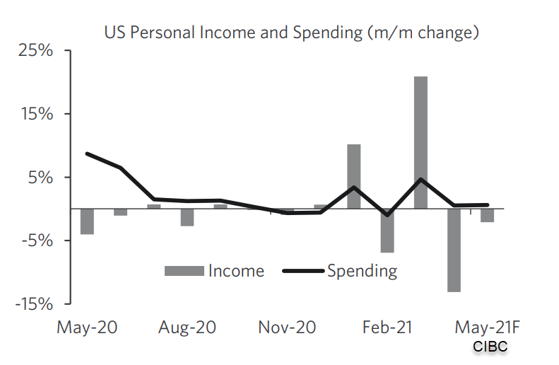 For the PCE report, CIBC forecasts an above-consensus reading of +0.6% on personal spending (+0.3% exp) and is in-line on the +3.5% y/y core inflation number.