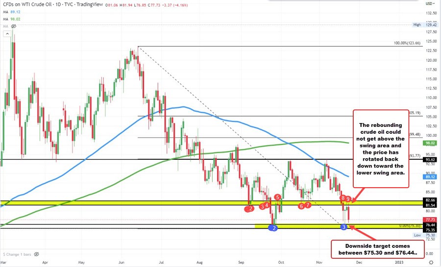 The price of WTI crude oil futures are settling the day down $3.01 or -3.72% at $77.94. The move lower reached a intraday low $76.85. That was close to the low from Tuesday’s trade at $75.30. The closing level from the end of year 2021 was at $75.35.