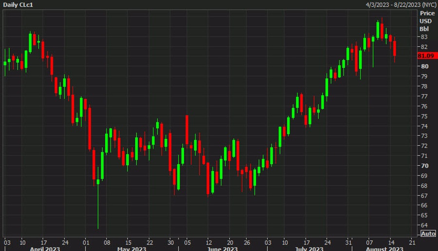 WTI crude oil settled lower by $1.52 to $80.99. It’s the first close below $81 since Aug 2 and the intraday low of $80.40 is the worst level in a week. Post-settlement, it has made some progress and is trading at $81.08.