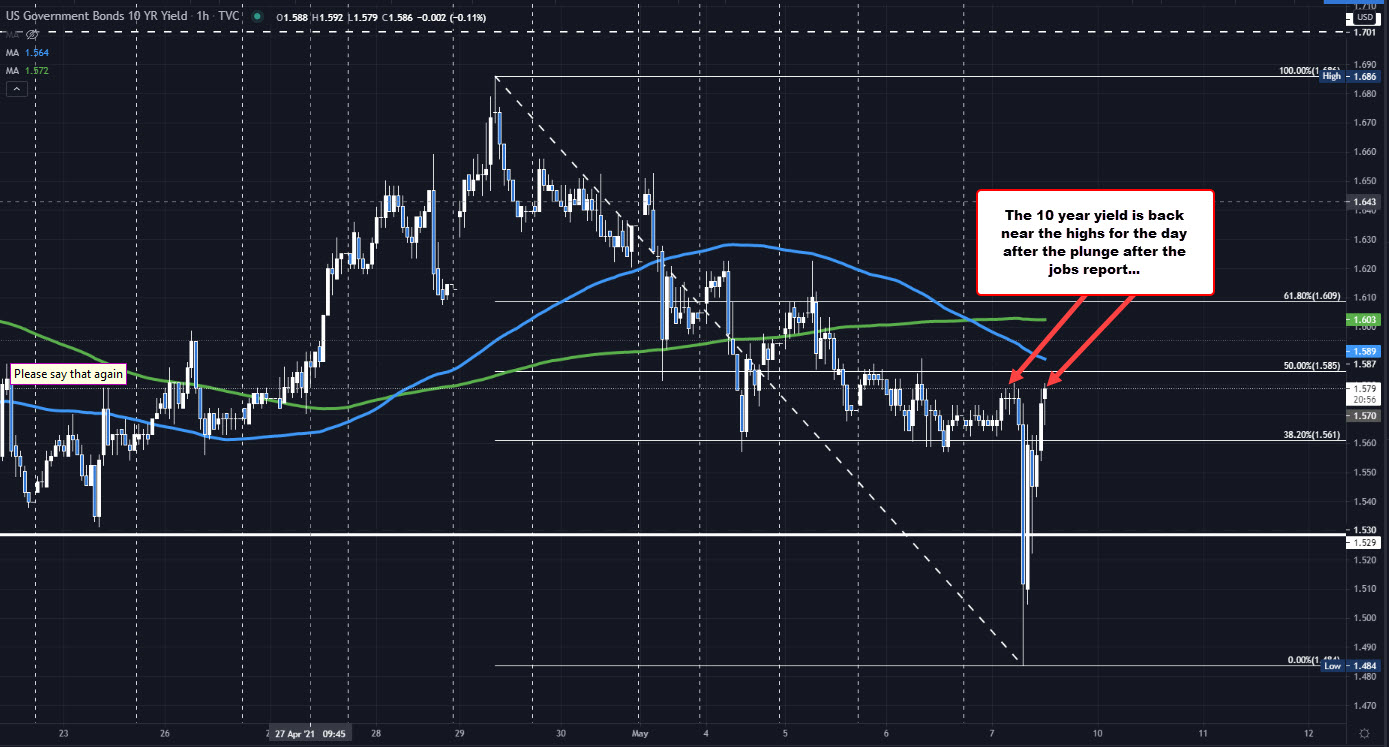 Technically, the 50% of the move down from the April high comes in at 1.585%. The following 100 hour moving average comes in a 1.589%. The yield last traded above its 100 hour moving average on May 3.