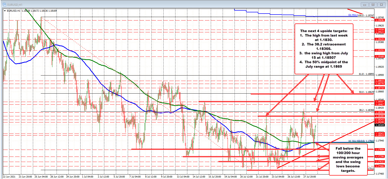 EURUSD: Current price is at 1.1815.  The 100 and 200 hour moving averages are converged at the 1.1790 level - 25 pips from the current level – .  The price earlier today tried to break below that level in the NY session but snapped back within an hour.  A break below will be a bearish tilt. Stay below, and we should see a run toward the lows seen over the last few weeks including 1.1770, 1.17632, 1.17566 and the low for July at 1.17512.  Break below the low of July and traders will start to think about the low for 2021 at 1.17041.