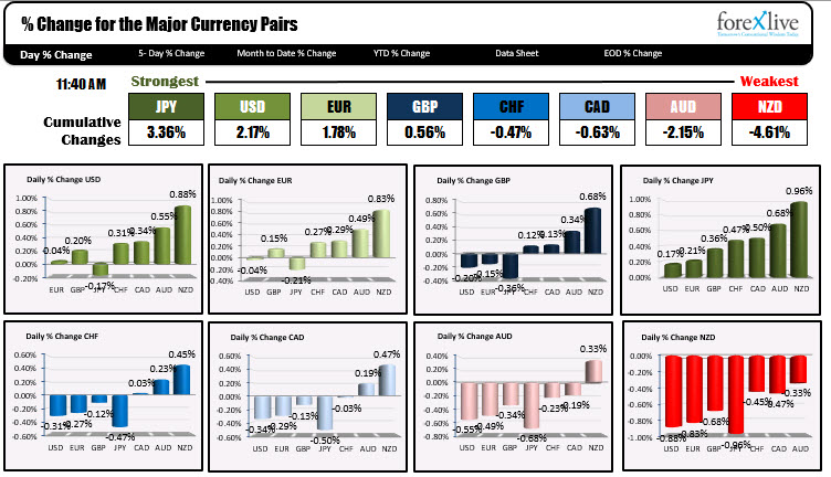 As European/London traders look to exit for the day, the JPY remains the strongest and the NZD is the weakest of the major currencies. That was the ranking when the US stocks opened for trading a few hours ago.. The USD was the strongest at the start of the North American session.