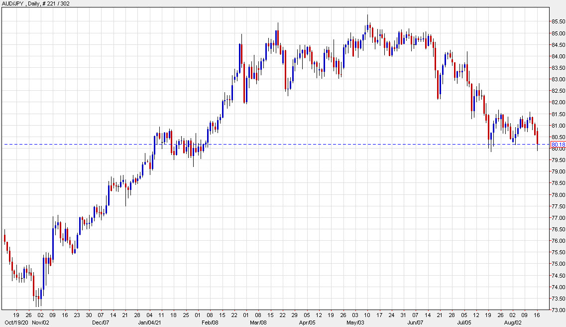 AUD/JPY slumped as low as 79.89 yesterday, just above the July low of 79.84. It’s since rebounded 30 pips but remains within the danger zone as we count down to the minutes of the August 3 RBA decision.