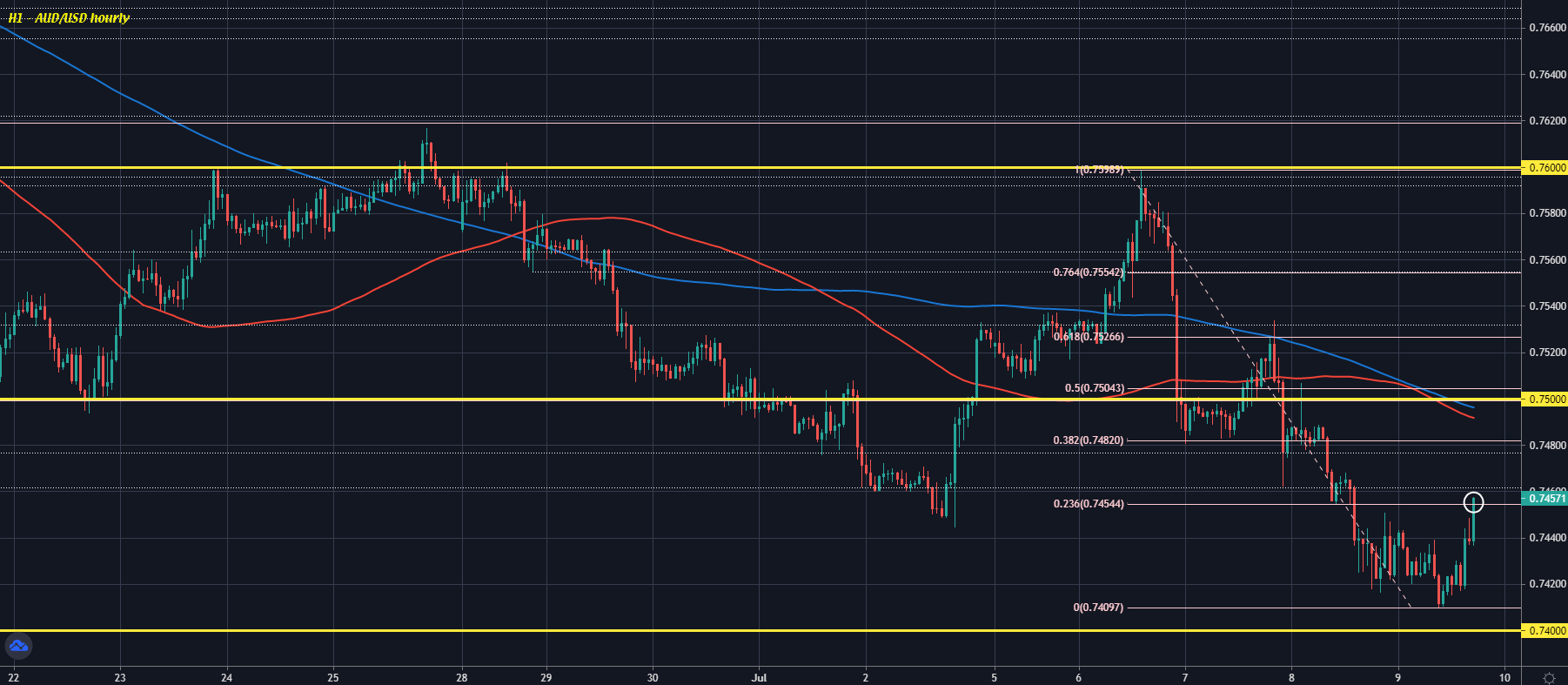 AUD/USD turns around the earlier drop to climb to 0.7460