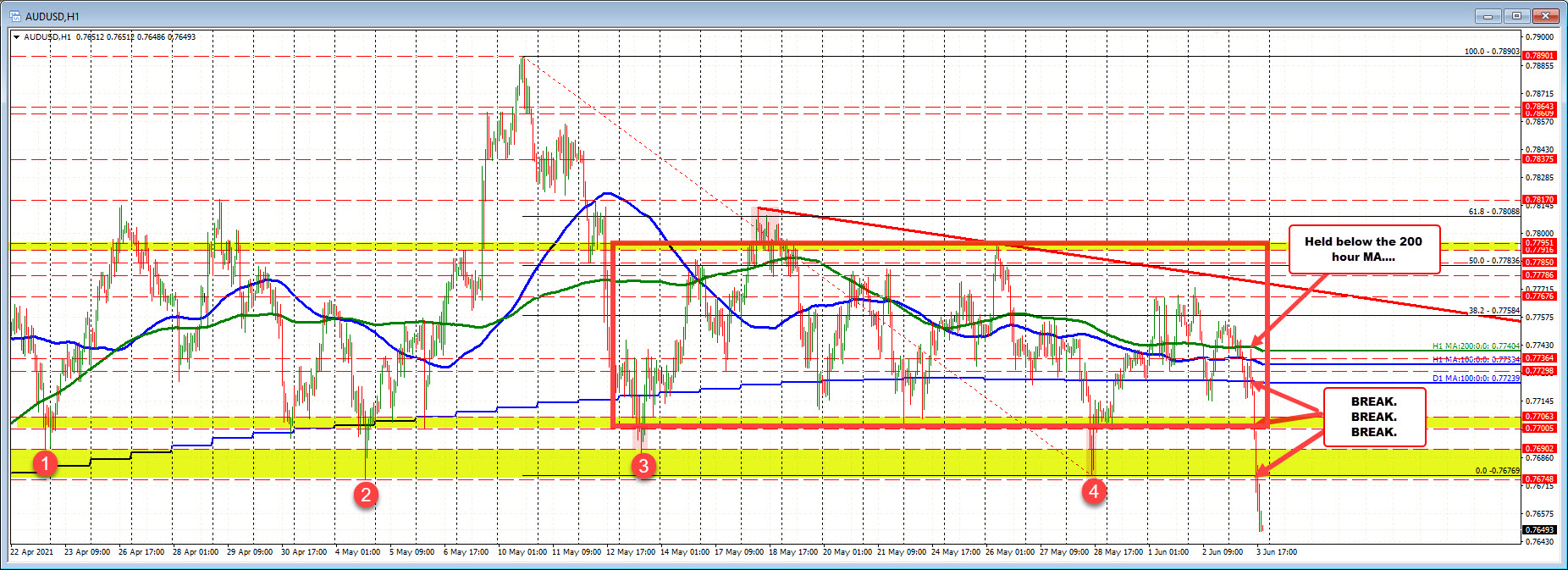 The price is currently trading near the intraday low of 0.7647 as sellers trend the pair after the non-trending up and down market that confined the range since May 12 (see red box in the chart above).
