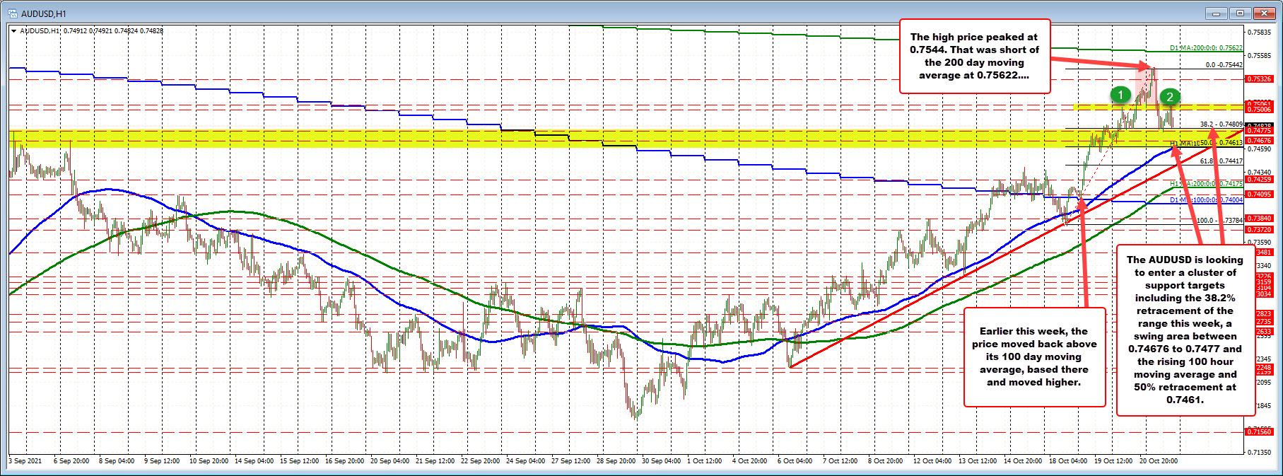 The move to the downside today has seen the price move back below a swing area around the 0.7500 level. The low price stalled near 0.7477. That is near the high of a cluster of support target including the: