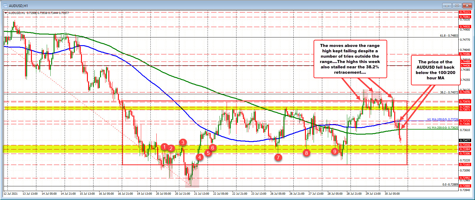 The price of AUDUSD has fallen back below its 100/200 hour MAs at 0.73726 and 0.7362 respectively. IN the process, the bias has shifted more to the downside for the pair.