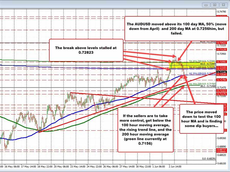 AUDUSD falls back to 100 hour MA after break above 200 day MA fails