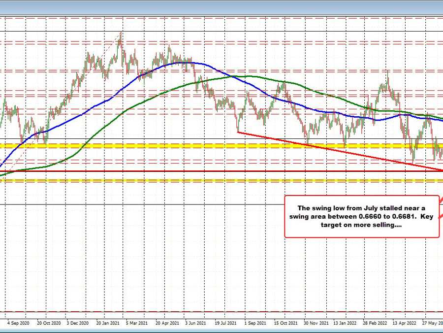 Drilling to the hourly chart, the low from last Thursday and yesterday stalled at 0.6771 area. It would now take a move back above that level to give the buyers some hope. The falling 100 hour moving average at 0.6805 would be a another target that would need to be broken. Earlier today, it was broken in the Asian session but momentum could not be sustained and after moving back below buyers turned to sellers against the level.