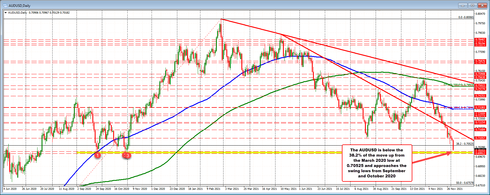 The AUD is the weakest currencies on the day, and the pair is pushing to a new 2021 low and moves toward the swing lows from October in September 2020. Those levels come in between 0.6991 and 0.7005. The low price just reached 0.7013. A move below that floor area would increase the bearish bias for the pair.