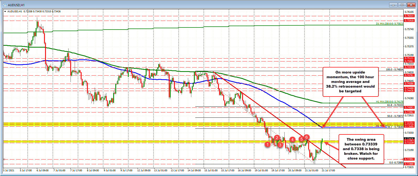 Buyers are making a play.  Can they keep the momentum going?.  Watch 0.73286  to 0.7333 for intraday clues.  Stay above and the buyers can continue the corrective push to the upside with the 100 hour moving average as the next key target