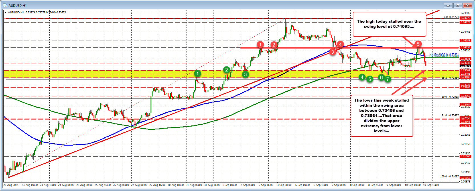 The move to the upside was able to extend back above its 100 hour moving average (blue line in the chart above). However, after moving up to test a swing line at 0.74095 (see red numbered circles) and holding against that level, the price has pushed back lower and below the 100 and 200 hour moving averages.