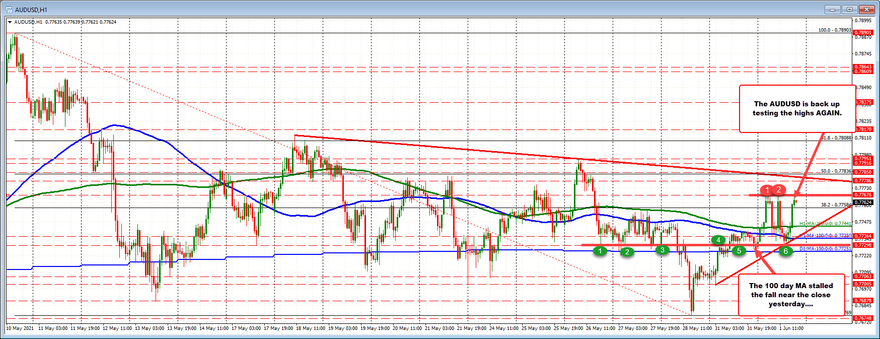 Having said that, and despite the buyers below, there is a ceiling being developed at 0.77676. That area has stalled the rises today on three separate occasions (including on the last hourly bar).