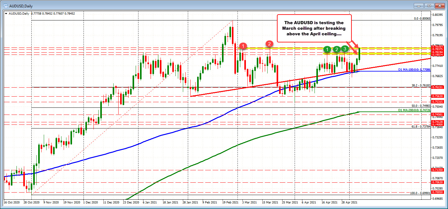 SUMMARY: Buyers are making the break out play in the AUDUSD on the hourly chart on the break of the hourly ceiling, but has another target ceiling on the daily chart at the March highs.  If that ceiling is resolved on a break, the buyers will have even more control.  If it can’t traders will be eying that old April ceiling for close support.