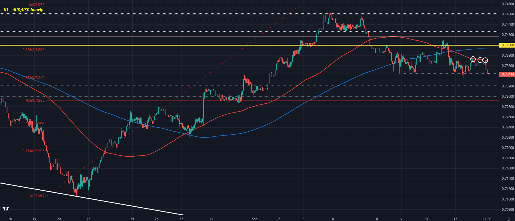 AUD/USD is keeping pressured below its key hourly moving averages, with sellers defending the 100-hour moving average (red line) to start the week.