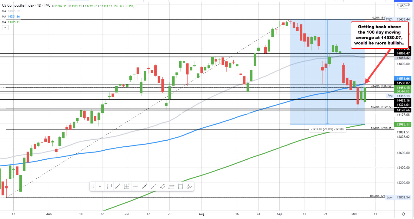 The NASDAQ index remains below its 100 day moving average at the 14531 area. A move above that level would increase the bullish bias.