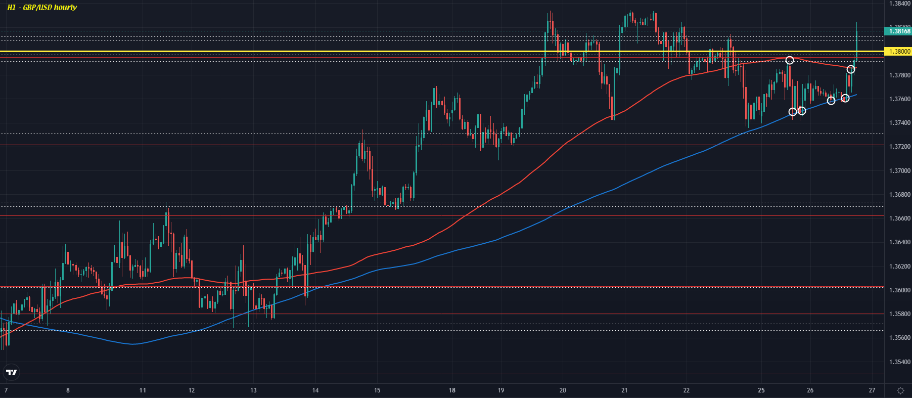 GBP/USD trades up by 0.4% to 1.3820 on the day