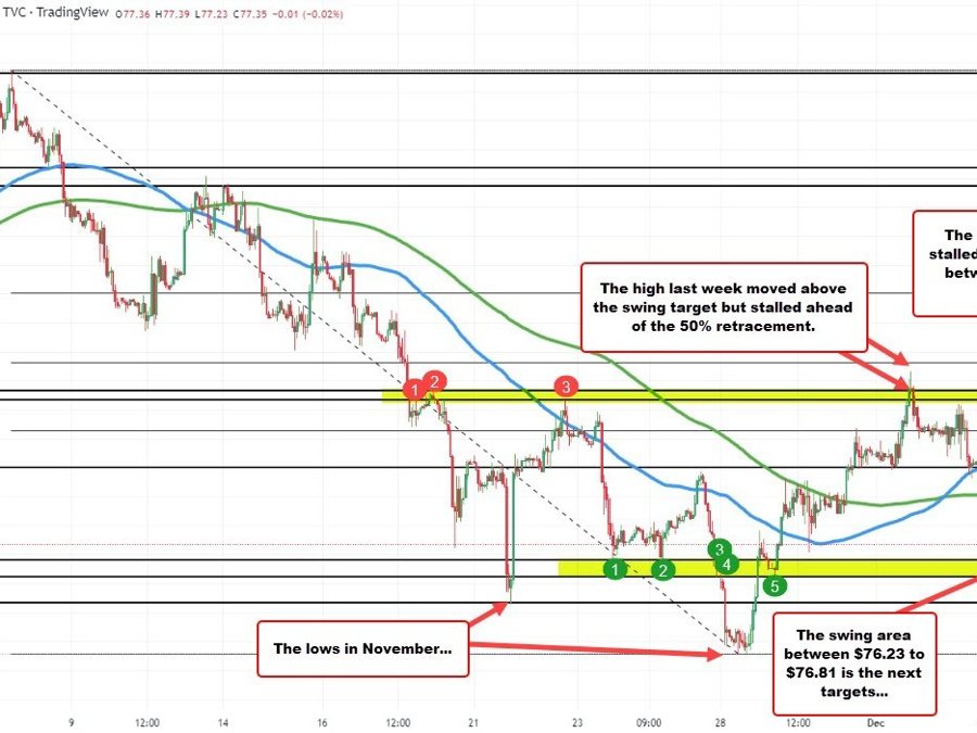 Technically speaking, the high price today stalled near the high of a swing area defined by swing highs on the hourly chart going back to November 17, November 18 and November 22 (see yellow area and red number circles). That swing area comes between $82.35 and $82.66. Last week on Thursday the price moved above those levels but fell short of the 50% midpoint target of the move down from the November 7 high. The high price reached $83.32. The 50% midpoint came in at $83.66.