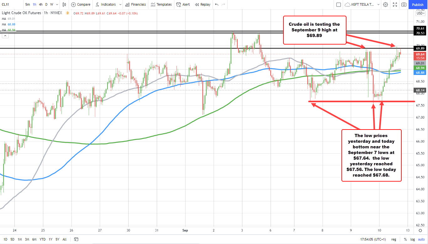 Technically, between the high and low sent the 100, 200 hour moving averages. They are currently at $68.88 and $68.94. With the price currently trading at $69.64, the price is above those moving averages which tilted the bias a little more in the favor of the buyers.