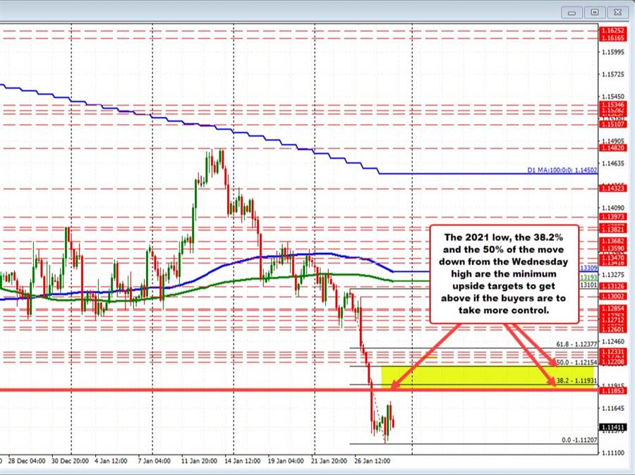 Unless the price can extend back above that low and then the 38.2% retracement of the move down from the Wednesday swing high at 1.1193, the sellers remain in firm control. Move above and there still would be more work to do but the buyers would have had some corrective success back to the upside.
