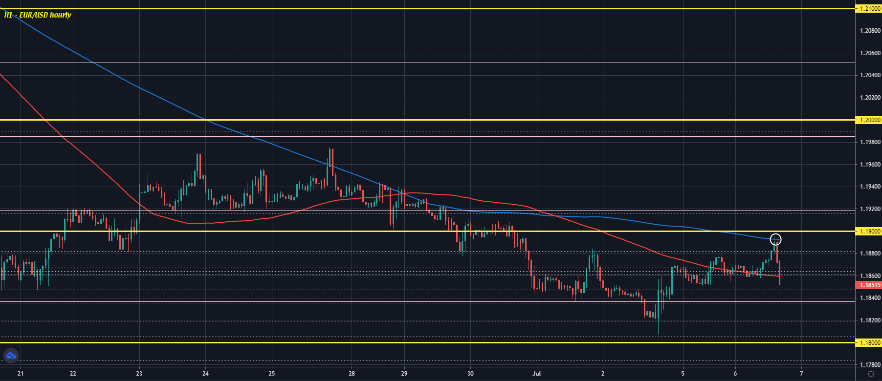 Of note, EUR/USD is being pushed to fresh lows of 1.1847 after having seen the earlier upside push rejected by the 200-hour moving average: