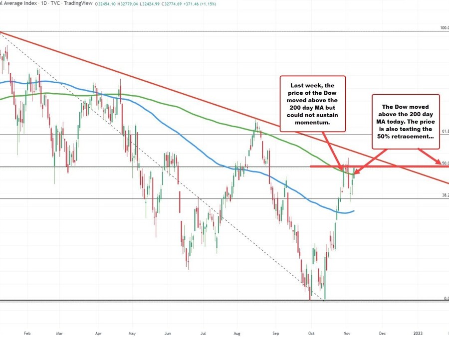 Also in play for the Dow index is the 50% of the move down from the January 2022 high. That level comes in at 32806.80. The price has moved above that level now on the last run higher.