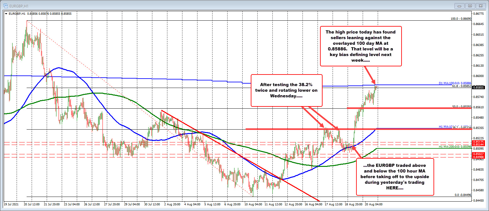Today although there has been ups and downs, the pair has pushed higher in the NY session and has moved up to test its key 100 day moving average at 0.85886.  That moving average has put a stall on the upside over the last four trading hours. The high price reached 0.85883, just short of that MA level.