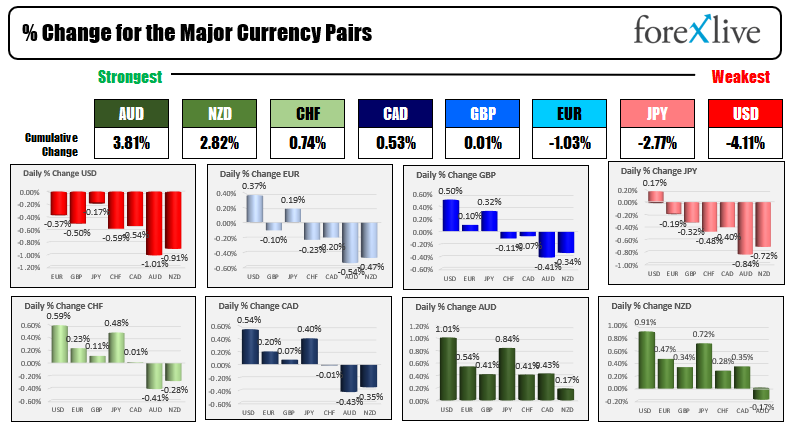 In the forex, the US dollar is the weakest of the major currencies. The AUD and NZD are the strongest as risk on flows send those pairs higher.
