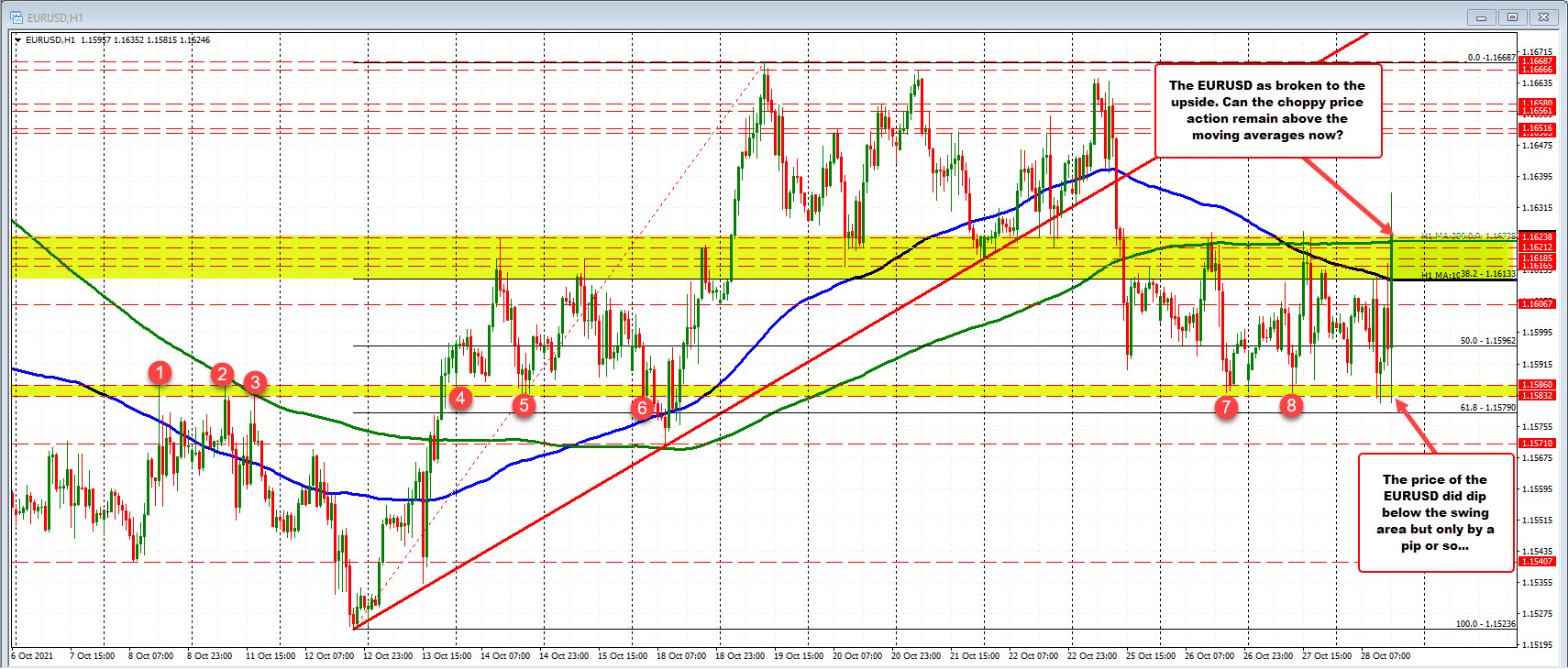 The price break to the upside has now seen the price move above both the 100 hour moving average at 1.16133 and the 200 hour moving average at 1.16238. Both on Tuesday and Wednesday, the price skimmed above those levels only to quickly reversed back to the downside (they had their own shots and superficial wounds as well). Traders will now watch those moving averages as support. Stay above tilt the bias to the upside.