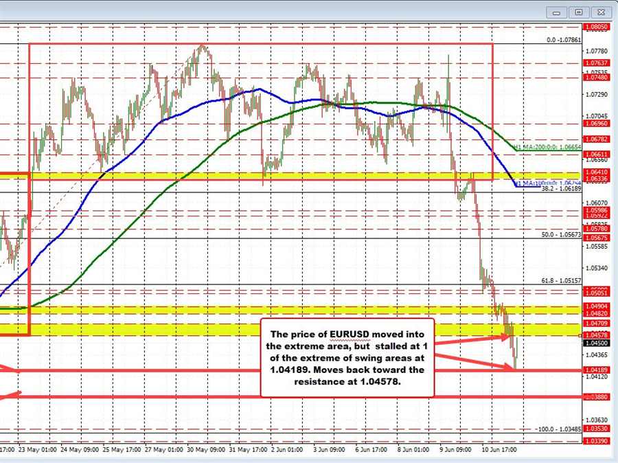 The move below 1.04578 took the price down to a swing area at 1.04189, where momentum to the downside stalled (see green numbered circles in the chart above), the price has seen a rebound of the last hour or 2 of trading. The close resistance comes against the 1.04578 level (the low of the lower red box)..