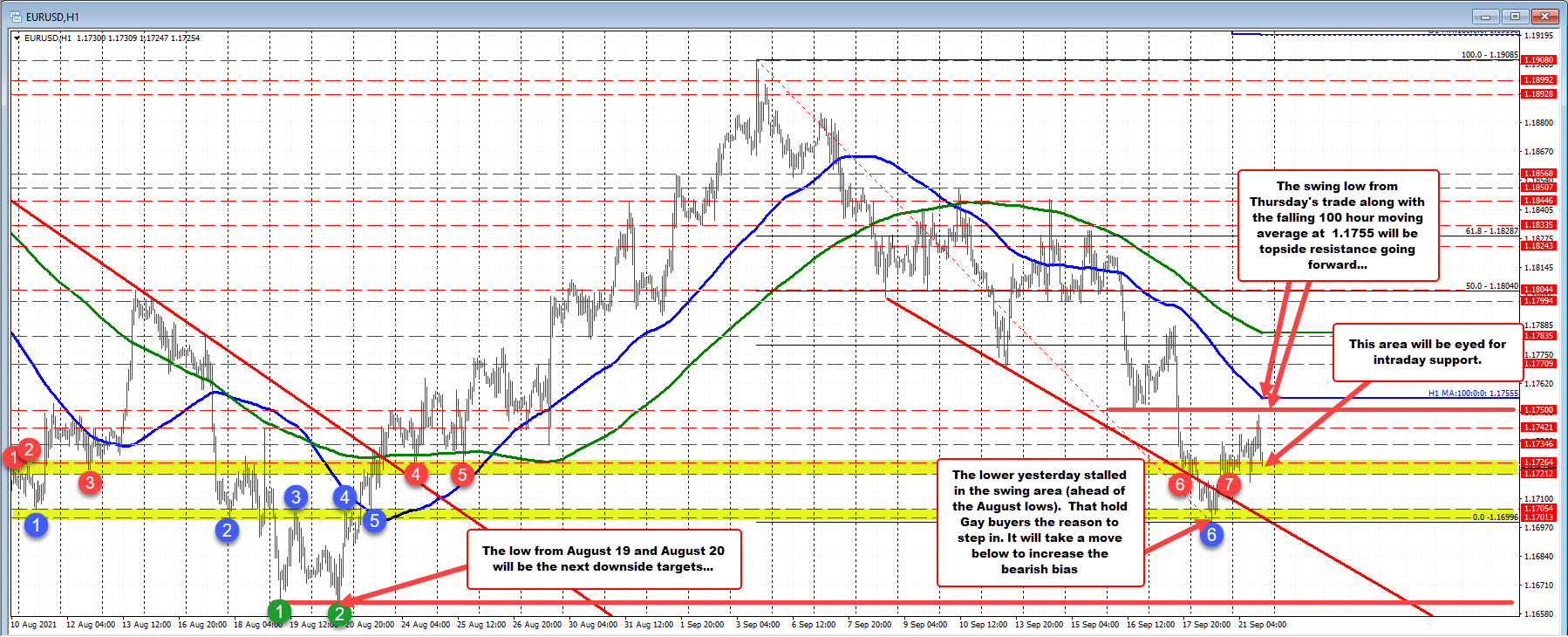 Clearly the 1.1700 level is a level the market is paying attention to and like the 100 hour moving average above, a move below the 1.1700 level will be needed to increase the bearish bias (and a run toward the low from August 19 and August 20 at 1.1963 area).