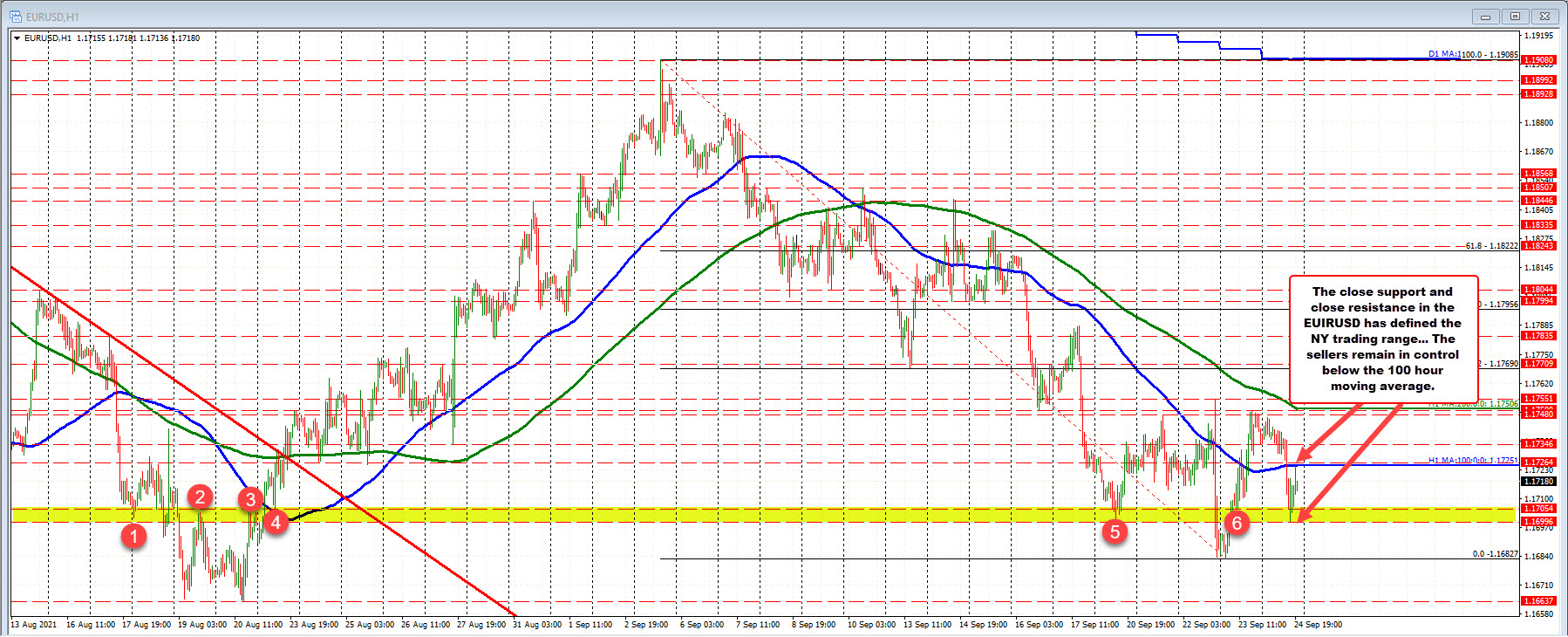 The support comes in at the swing area between 1.16996 to 1.17054, and the close resistance at the 100 hour MA at 1.17251.