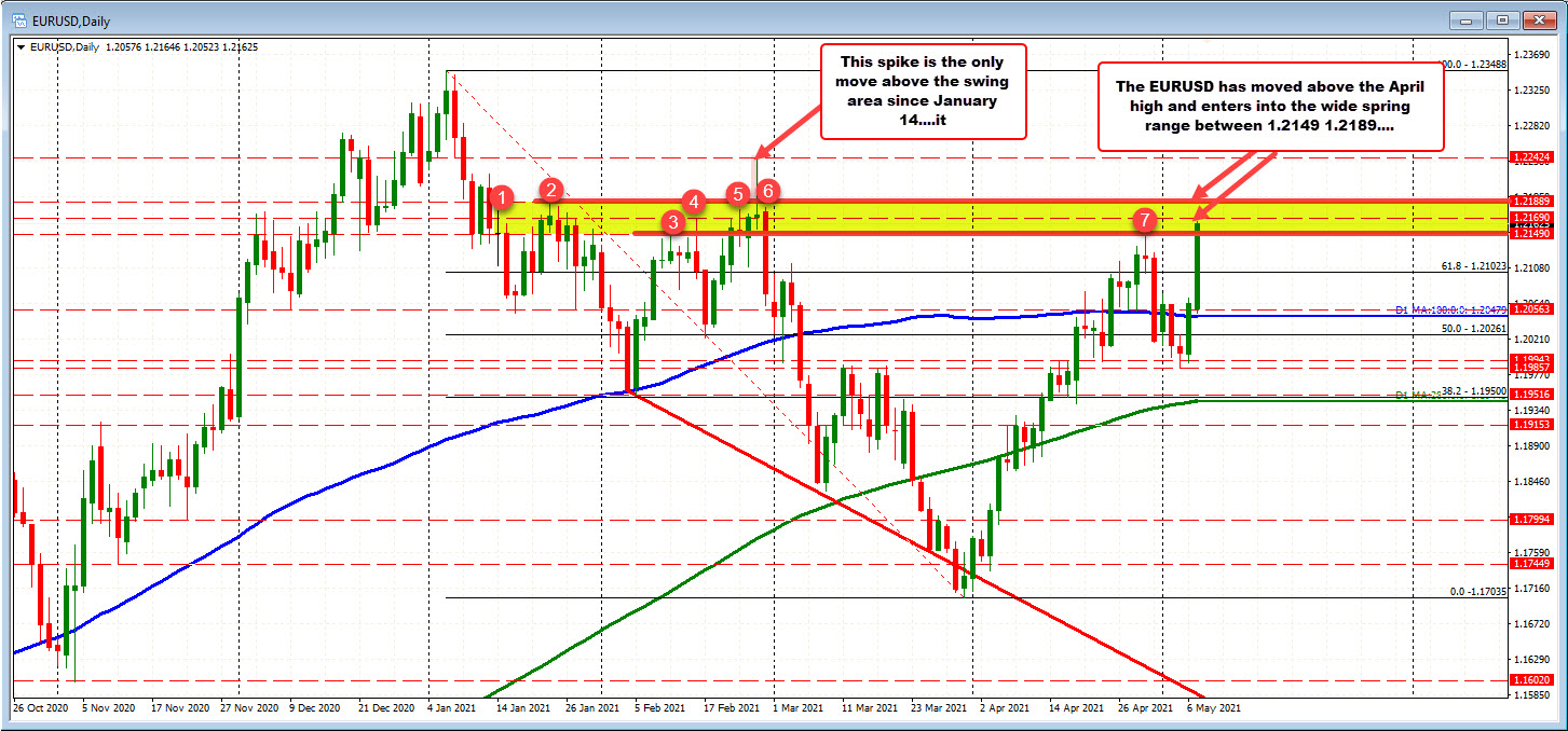 The EURUSD is trading to a new session highs and in the process has broken above the April high of 1.2149 and trades the highest level since February 26. The next targets comes at 1.2169 and 1.2189.