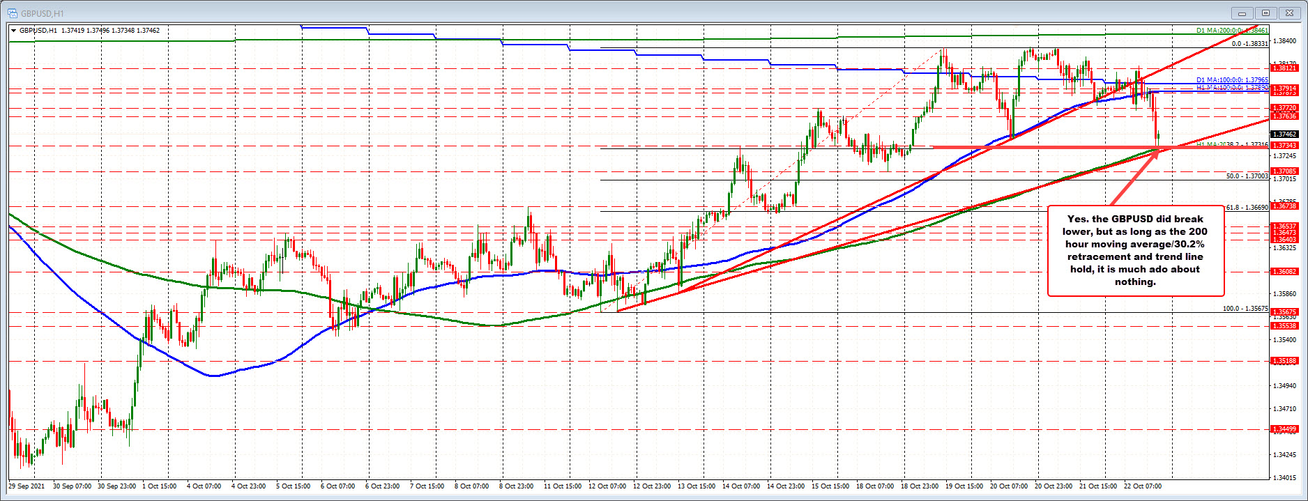 The pair’s decline has taken the price down to test its 200 hour moving average and 38.2% retracement of the move up from the October 12 swing low. Both of those technical targets come near the 1.37316 level (a rising trendline also cuts across right at that level). Those lows have so far held support which is good news (bullish)