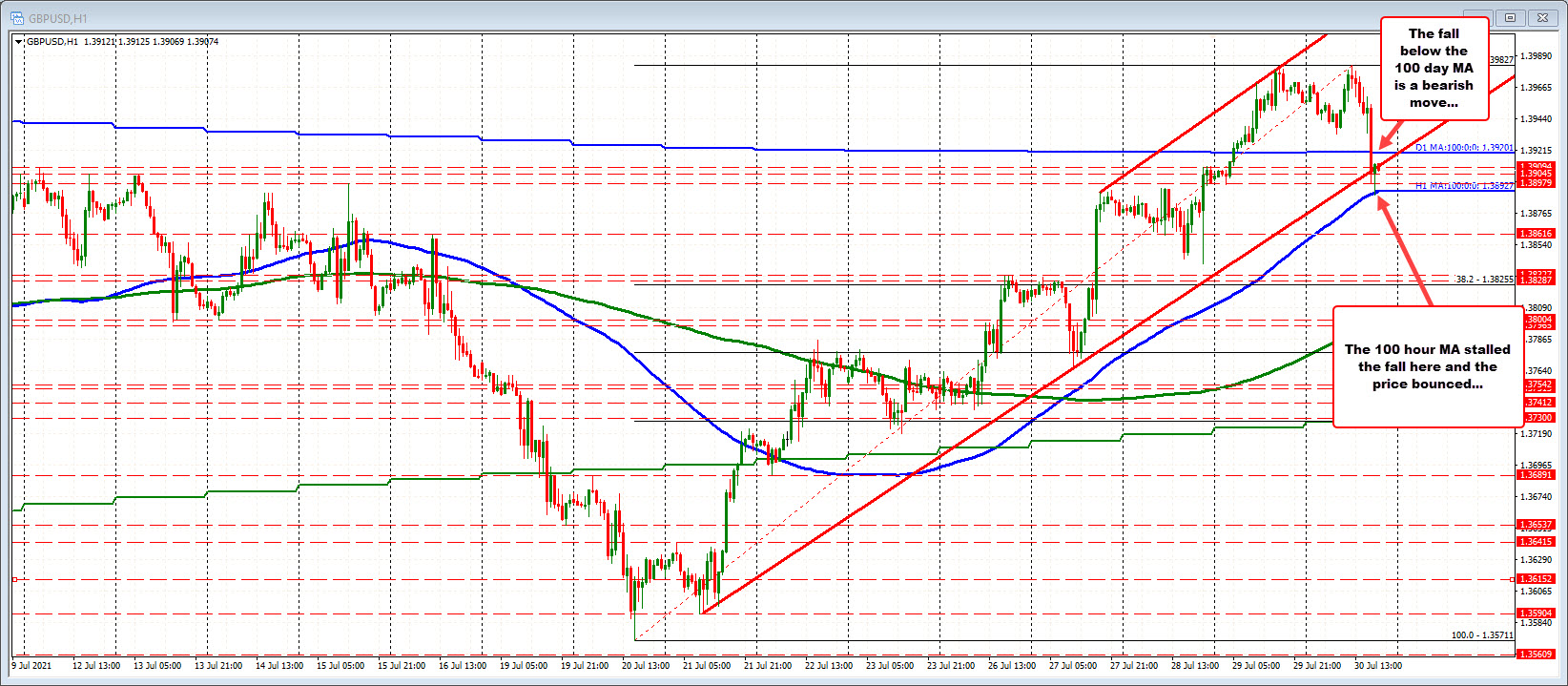 The GBPUSD fell to the low for the day as London traders exited for the day/week (and month for that matter). The low reached 1.3889. The 100 hour MA (at the time) was at 1.3891.  The price has since bounced and trades at 1.3909.