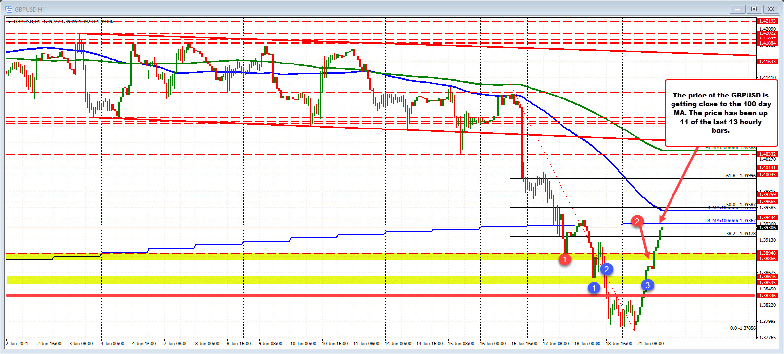 The GBPUSD is moving closer to its 100 day MA at 1.3937 (off the bid side prices). The high price  just reached 1.39317.
