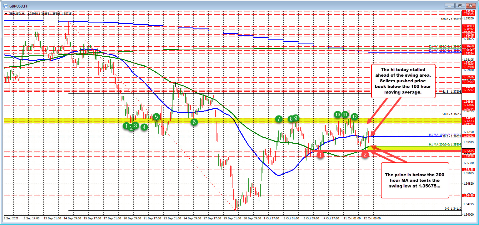 The GBPUSD has seen volatile up and down trading action today. The early European session swing low came down to 1.3567. That was near the swing low from last Thursday’s trade at 1.3569. The bounce off that level took the price back above the 200 and 100 hour moving averages on its way to a swing high at 1.36367. That level fell short of a swing area between 1.3640 and 1.3654.