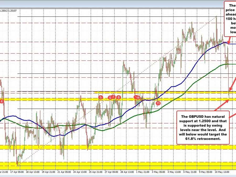 Returning to the hourly chart, the GBPUSD tumble has seen the price fall below the 50% of the move up from the April 17 low at 1.25158. The low price just reached 1.25012 – testing the natural support at 1.2500 in the process. There is a old swing area down to 1.24952 (see red number circles). The 61.8% retracement of the move up from the April 17 low comes in at 1.24772. That would be a another downside target on more downside momentum.